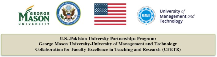The goal of the Collaboration for Faculty Excellence in Teaching and Research (CFETR) is to foster collaboration and strengthen person-to-person ties between the U.S. and Pakistan through faculty exchanges, joint research and scholarly work to further the collective understanding of effective pedagogical practices and expand research competencies.Through this initiative, Faculty Fellows from the University of Management and Technology (UMT) in Lahore, Pakistan, will participate in academic seminars developed at George Mason University and engage in research initiatives with Mason faculty in their fields. These activities are designed to expand academic capacity and infuse cross-cultural knowledge and international mindedness into educational practice. The project will bring two groups of 20 UMT Faculty Fellows each (total of 40) to the Mason campus, the first in Spring 2016 and the second in Fall 2016, for seminars, cultural exchanges and research. The seminars will cover a range of topics, including innovations in pedagogy and practice, curriculum refinement, marginalized populations in higher education, technology integration and performance-based assessments. The program's ongoing learning will be enhanced through online meetings and webinars. A highlight of the collaboration will be a UMT Research Conference for CFETR Faculty Fellows in Spring 2017 in Lahore, where Fellows and other faculty participants from the two universities will share the results of their work. UMT and Mason faculty also will disseminate their joint research through participation in international conferences and publications. The project is funded by the U.S.-Pakistan University Partnerships Program of the U.S.-Pakistan Academic Linkages Program of the U.S. Department of State Public Affairs Section, U.S. Embassy, Islamabad.