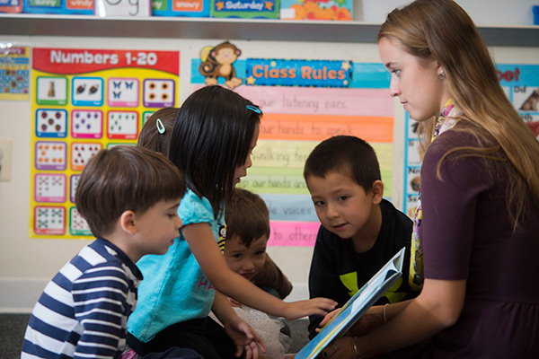 Young children enjoy reading time with Amanda Malone (right). The senior at George Mason University is enrolled in the five-year accelerated bachelor's/master's degree program in elementary education, offered through the College of Education and Human Development. Photos by Evan Cantwell.