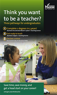 To learn about these options, download the "Think you want to be a teacher?" brochure or visit the website at cehd.gmu.edu/thinkteacher.