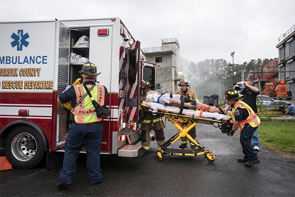 George Mason University works with Fairfax County Fire and Rescue to conduct a live training drill. Dozens of proximity beacons, activity sensors, and ultra small microcomputers were deployed -- on EMTs, firefighters, equipment, ambulance, and more -- to capture, analyze, transmit, and display data in real time from the first responder team to a medical/surgical team at INOVA Fairfax Hospital. Photo by Alexis Glenn.