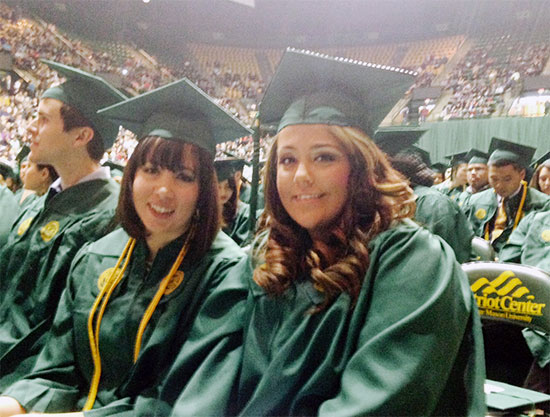 Kristina Skokan of Centreville, Va., and Nicole Froats of Las Vegas sat together at the ceremony. Both earned their bachelor’s degree from the College of Education and Human Development’s School of Recreation, Health, and Tourism, and each had extra reason to celebrate.