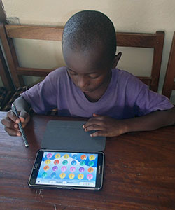 A youngster at the CRC uses a tablet to play education games and watch videos such as those created by Mason students.