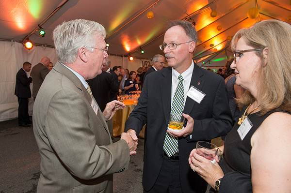 Rob Johnson (left), director of advancement for the College of Education and Human Development, speaks with Kurt and Katherine Thompson at the launch of "Faster Farther," the campaign for George Mason University.