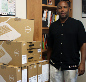 Dr. Kevin Clark receives the first shipment of Dell equipment for the Game Design @ Mason Afterschool program. Photo by Jari Fofana.