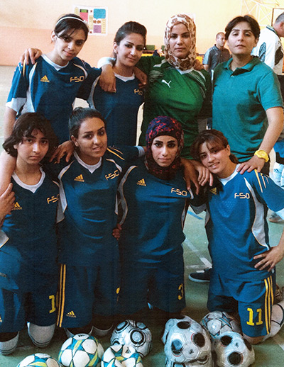 Members of a female soccer league in Iraq pose in front of donated soccer balls from the United States.