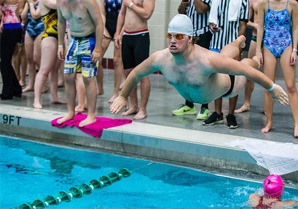 George Mason sororities and fraternities compete in the annual Aquatics Night at the Aquatic and Fitness Center on the Fairfax campus. Aquatics Night is an annual competition during Greek Week. Photo by Craig Bisacre/Creative Services/George Mason University.