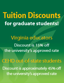 Please note: The tuition discount is not available to students who take CEHD courses but are primarily enrolled in a program offered by another college at the university. The tuition discount also cannot be applied to non-credit-bearing courses or already discounted "contract" courses. (Contract courses are those offered to teachers and other educators through arrangements made between a qualifying organization and George Mason University).