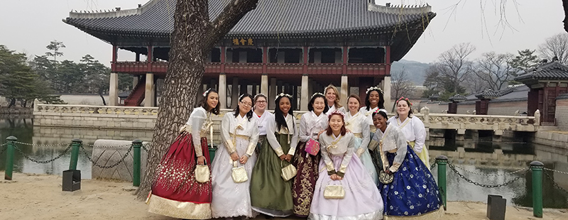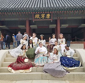 Chung and her students had ample time to get to know each other, too, as the group set out on a tour of Korean culture. At the Gyeongbokgung Palace they watched the changing of the guard, with the guards dressed in traditional Korean Hanbok. They tried out traditional meals during a food tour and also explored on their own.